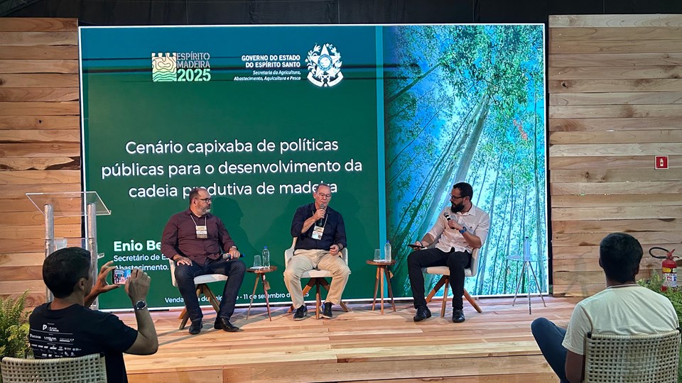 O secretário de Estado da Agricultura, Abastecimento, Aquicultura e Pesca, Enio Bergoli, participou do painel “Cenário capixaba de políticas públicas para o desenvolvimento da cadeia produtiva de madeira”, ao lado do gerente técnico do Senar-ES, Murilo Pedroni, e do diretor-geral do Instituto Jones dos Santos Neves, Pablo Silva Lira. Na ocasião, ele destacou a importância do setor florestal para a economia capixaba e reafirmou o compromisso do Estado em ampliar políticas públicas que estimulem inovação, sustentabilidade e competitividade.