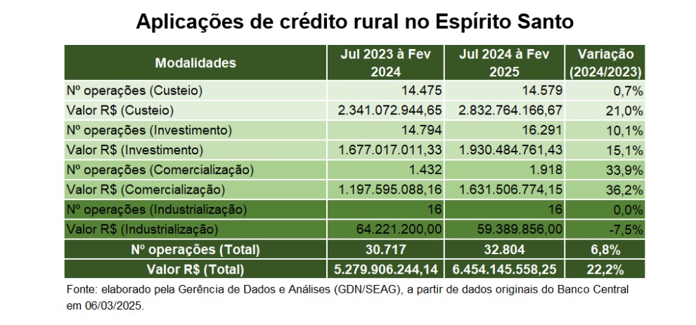 A aplicação de crédito rural no Espírito Santo cresceu 22% no decorrer de oito meses do ano-safra, após o lançamento do Plano de Crédito Rural realizado em julho de 2024 pelo Governo do Estado, em parceria com a União e diversas instituições financeiras e representativas dos produtores rurais e pescadores. O valor aplicado é referente aos meses de julho de 2024 a fevereiro de 2025, em comparação com o mesmo período do ano-safra anterior. Entre os estados brasileiros, o Espírito Santo foi o único a ter resultado positivo, enquanto os demais estados decresceram e levaram a média geral do crédito rural aplicado no Brasil a cair 19%.