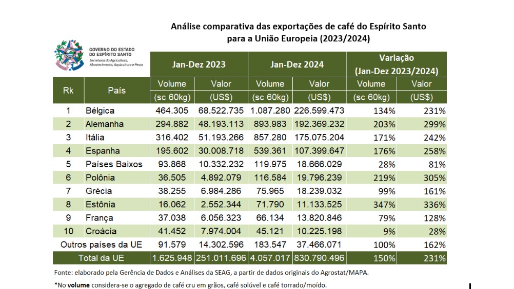 Para ter dimensão do tamanho desse crescimento, em termos percentuais em 2023, o bloco da União Europeia representou 26,2% do volume total de café exportado pelo Espírito Santo. Já em 2024, saltou para 40,3%, o que demostra uma clara ampliação da demanda europeia pelos cafés do Espírito Santo.