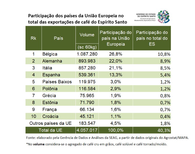 Além dos dez principais importadores (Bélgica, Alemanha, Itália, Espanha, Países Baixos, Polônia, Grécia, Estônia, França e Croácia), outros 16 países do bloco também compraram café capixaba em menor escala. No conjunto, os países da União Europeia foram responsáveis por comprar 40,3% do volume do complexo cafeeiro exportado pelo Espírito Santo em 2024. Considerando café cru em grãos, café solúvel e café torrado/moído, o Espírito Santo exportou no total para todos os países do mundo, cerca de 10,1 milhões de sacas no último ano.