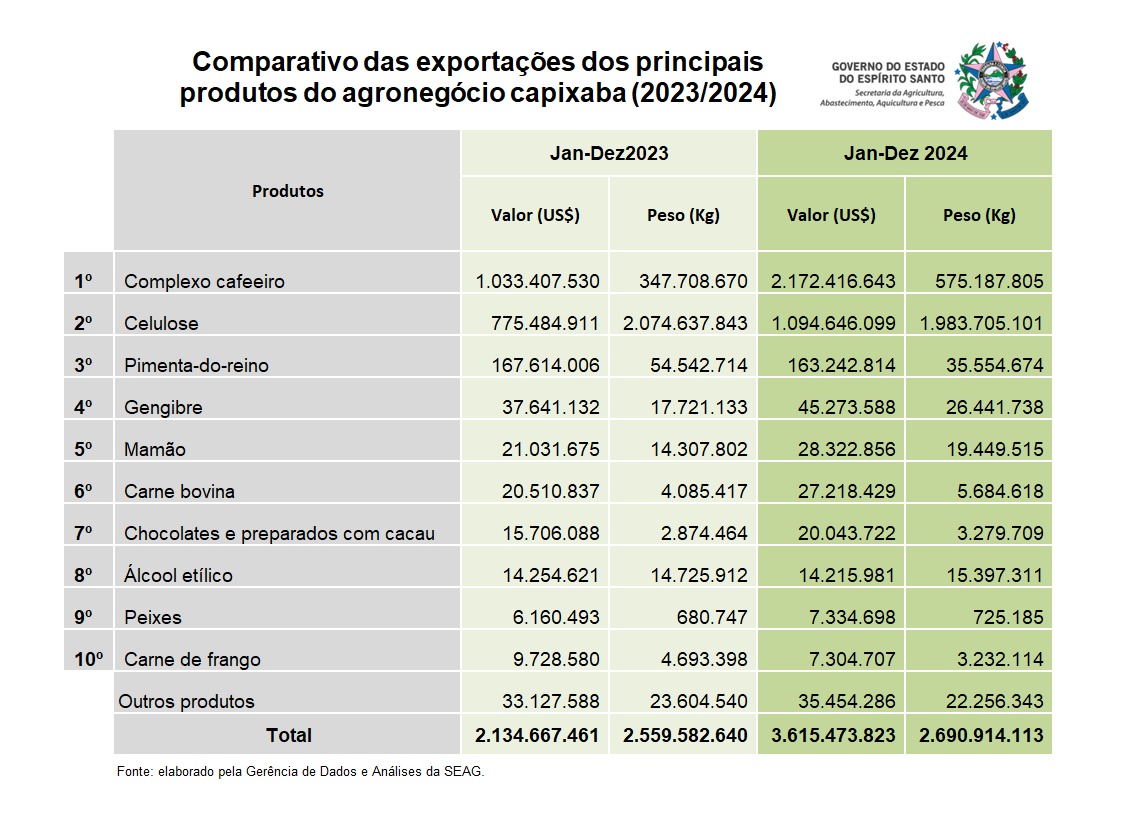 “O ano de 2024 entrou para a história com um marco importante para o agronegócio capixaba, que segue ampliando a participação no comércio exterior e alcançando desempenhos econômicos significativos. De janeiro a dezembro do último ano, superamos em 69,4% todo valor comercializado em 2023, com divisas acima dos 3,6 bilhões de dólares. Os preços internacionais foram bons para boa parte de nossos produtos, e com a alta do dólar, levou a um aumento expressivo no valor comercializado pelo Espírito Santo. O café teve volumes recordes exportados, principalmente o Conilon, que se consolidou como o principal produto da nossa pauta de comércio exterior do agro”, comemorou o secretário de Estado da Agricultura, Abastecimento, Aquicultura e Pesca, Enio Bergoli.