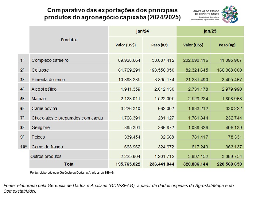 Em janeiro, dez produtos se destacaram em geração de divisas. O complexo cafeeiro ficou em primeiro lugar com US$ 202,1 milhões (63%), seguido por celulose com US$ 82,3 milhão (25,7%), pimenta-do-reino com US$ 21,2 milhões (6,6%), álcool etílico com US$ 2,7 milhões (0,85%), mamão com US$ 2,5 milhões (0,79%), carne bovina com US$ 1,8 milhão (0,57%), chocolates e preparados com cacau com US$ 1,8 milhão (0,55%), gengibre com US$ 1,1 milhão (0,34%), pescados com US$ 781 mil (0,24%) e carne de frango com US$ 617 mil (0,19%). O conjunto de outros diversos produtos do agronegócio somou US$ 3,9 milhões (1,21%).
