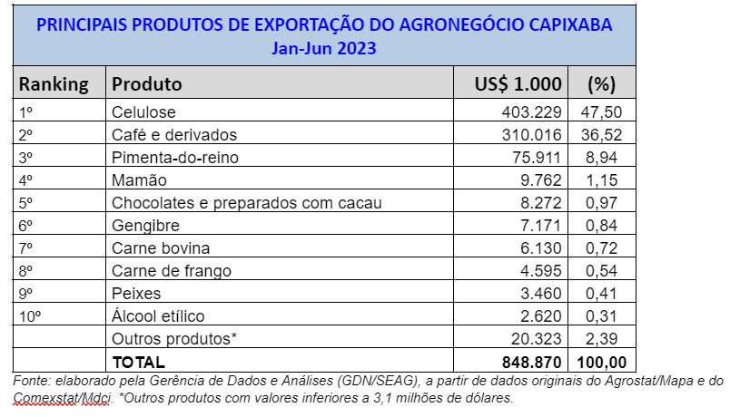 No primeiro semestre do ano, o valor das divisas com as exportações do agronegócio do Espírito Santo somou US$ 848,9 milhões de dólares, um crescimento de 8,8% em relação ao ano de 2022. As maiores variações positivas entre os principais produtos sobre o valor comercializado foram para gengibre (+88,9%), celulose (+18,6%), café e derivados (+9,1%) e chocolates e preparados com cacau (+1,2%). Os três principais produtos da pauta das exportações do agronegócio capixaba (celulose, complexo cafeeiro e pimenta-do-reino) representaram mais de 92,9% do valor total comercializado de janeiro a junho deste ano.