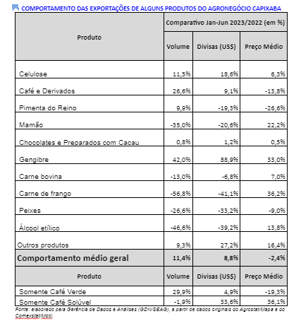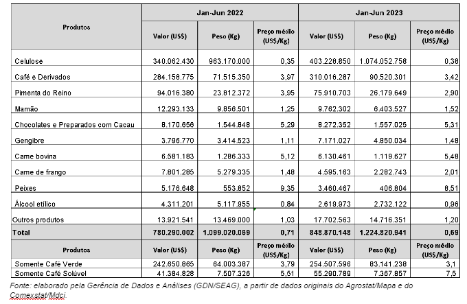 O crescimento do volume comercializado no primeiro semestre foi devido a variações positivas do gengibre (+42%), café e derivados (+26,6%), pimenta-do-reino (+9,9%) e celulose (+11,5%), que compensaram a queda da quantidade exportada de mamão, carne de frango e peixes. No comportamento dos preços médios internacionais, houve queda para pimenta-do-reino (-26,6%) e do complexo cafeeiro (-13,8%) e peixes (-9%), e alta de preços para carne de frango (+36,2%), gengibre (+33%) mamão (+22,2%) e celulose (+6,3%). A variação de volumes e preços se refere à comparação dos dados acumulados de janeiro a junho de 2023/2022.