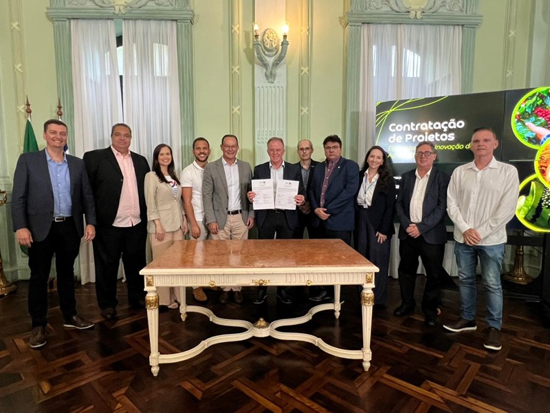 O Governo do Estado realizou, nesta quarta-feira (11), no Palácio Anchieta, em Vitória, a assinatura da contratação de dois projetos vinculados ao Programa de Estruturação do Ecossistema de Inovação do Agro Capixaba: Agroinventores e Rotas Rurais ES. Durante o evento, também foi anunciado o Projeto de Mapeamento, Monitoramento e Comunicação Estratégica para a Consolidação da Governança do Ecossistema de Inovação do Agro Capixaba.