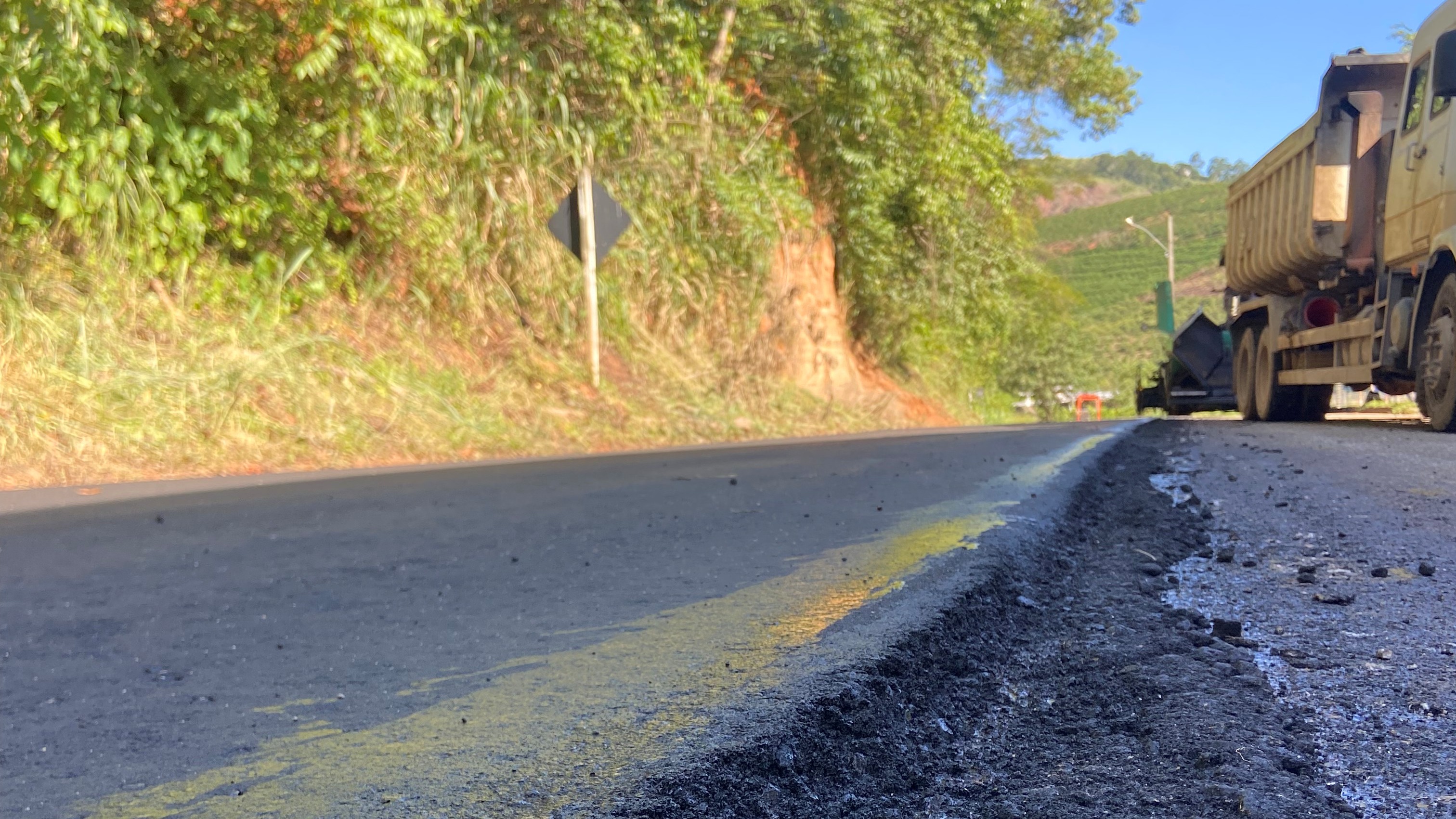 As obras incluem recapeamento asfáltico e nova sinalização horizontal e vertical, garantindo mais segurança, mobilidade e melhores condições para o escoamento da produção agrícola.
