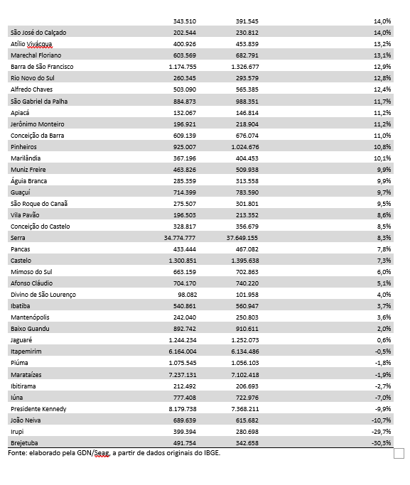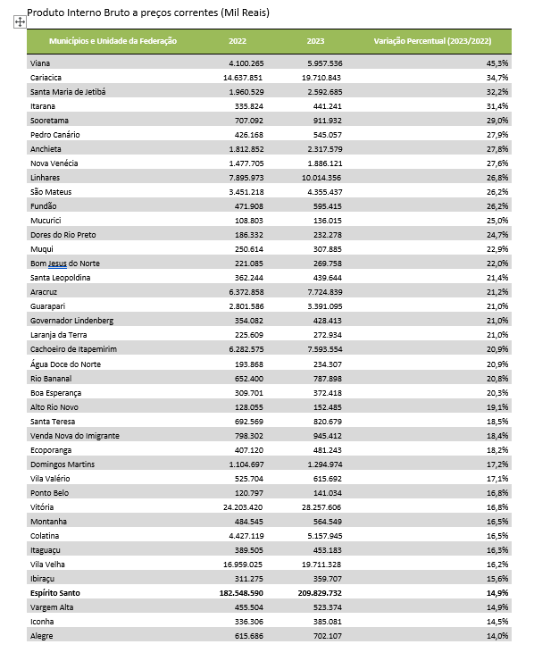 Os números também chamam atenção ao comparar o desempenho de municípios rurais com os grandes centros urbanos. Vitória (16,8%), Vila Velha (16,2%) e Serra (8,3%), apesar de concentrarem volumes absolutos elevados de PIB, apresentaram crescimento percentual inferior ao de diversas localidades com base agrícola. O dado reforça que, no período analisado, o ritmo de expansão econômica foi mais intenso no interior produtivo do que nos polos metropolitanos.