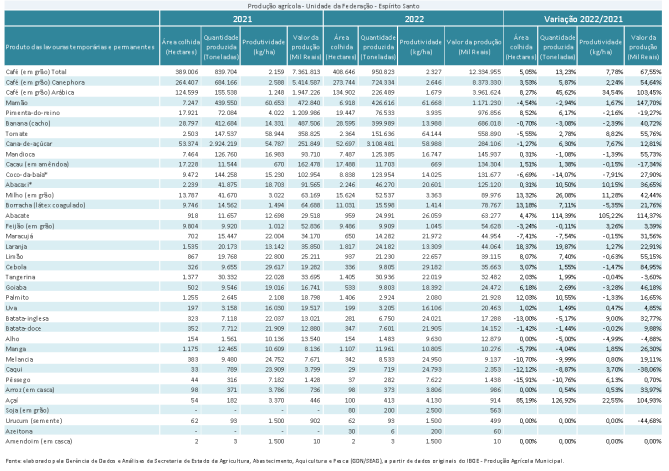 A produção agrícola no Espírito Santo, no conjunto de 36 produtos de base agrícola, entre lavouras permanentes e temporárias, teve aumento no ano de 2022, em relação ao ano imediatamente anterior. As principais variações positivas que contribuíram significativamente no crescimento da produção foram para o café arábica (+45,62%), cana-de-açúcar (+7,67%), pimenta-do-reino (+6,17%) e tomate (+2,78%), que compensaram a queda na produção de coco (-14,07%), banana (-3,08%), mamão (-2,94%) e mandioca (-1,08%).