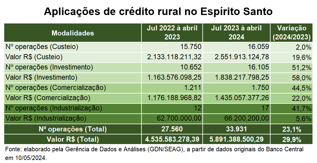 O Plano de Crédito Rural para o Espírito Santo na safra 2023/2024 tem como meta a aplicação de 7,8 bilhões até o final de junho de 2024, um valor recorde nos financiamentos para o setor agrícola capixaba. Os Governos Federal e do Estado contam com a parceria das principais instituições financeiras que aplicam crédito rural no Espírito Santo, como o Banco do Brasil, Banco do Estado do Espírito Santo (Banestes), Banco de Desenvolvimento do Espírito Santo (Bandes), Caixa Econômica Federal, Sicoob, Banco do Nordeste e Sicredi.