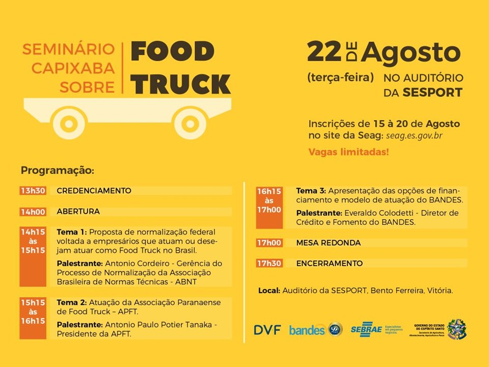 O seminário tem como objetivo reunir pessoas que já atuam neste setor, interessados em montar esse tipo de negócio, prefeituras municipais e órgãos de normatização e fiscalização. O evento contará com palestras com os temas de normalização federal para empresários que atuam ou desejam atuar no ramo de food trucks, atuação de associações, opções de financiamento e modelo de atuação do Bandes, além de uma mesa redonda para debater os temas apresentados nas palestras.