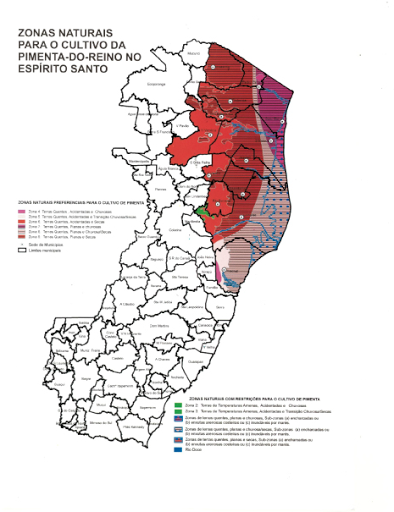 Antes do novo mapa, o último zoneamento realizado em 2008 identificava que apenas 13 municípios eram aptos para o cultivo da iguaria. Todos estavam situados na região Norte e Noroeste, onde predomina a cultura e onde estão localizados os maiores produtores da especiaria: Montanha, Pedro Canário, Pinheiros, Conceição da Barra, Jaguaré, Boa Esperança, São Mateus, Nova Venécia, Aracruz, Vila Valério, Rio Bananal, Linhares e São Mateus.